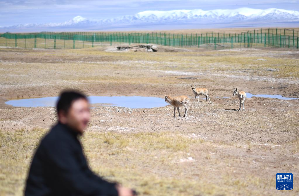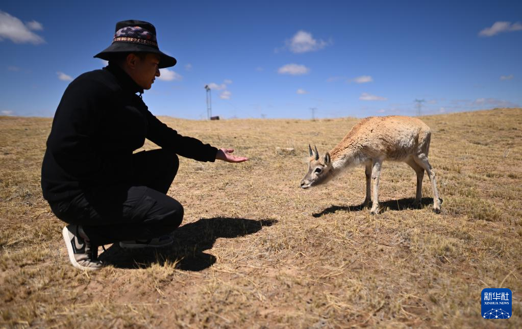 5月30日,在可可西里國家級自然保護(hù)區(qū)索南達(dá)杰保護(hù)站,巡山隊(duì)員才文多杰和藏羚羊在一起?!⌒氯A社記者 薛玉斌 攝