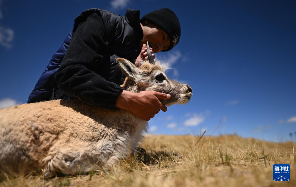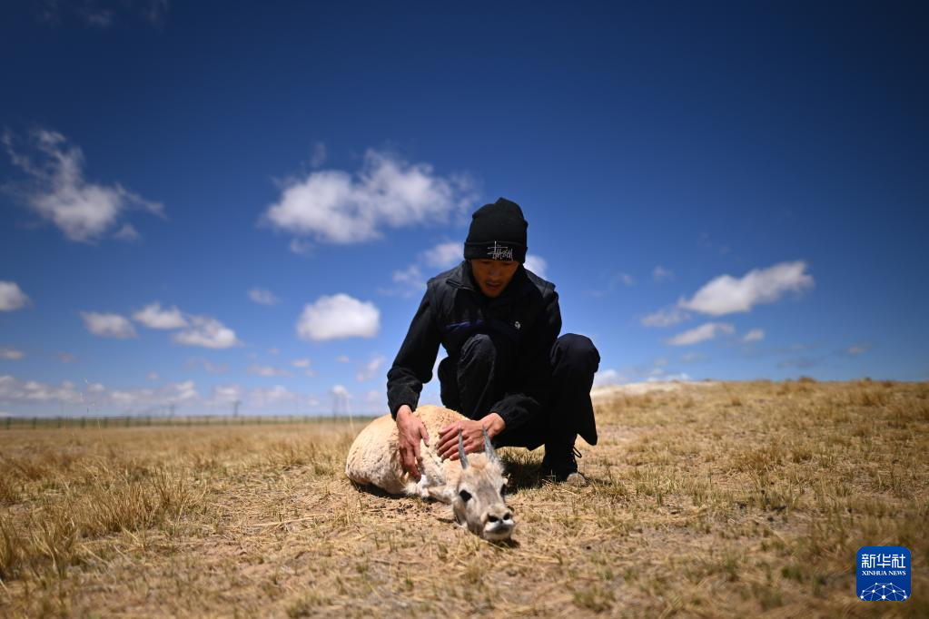 在可可西里國家級自然保護(hù)區(qū)索南達(dá)杰保護(hù)站,巡山隊(duì)員才文多杰在野生動物救助中心查看被救助的藏羚羊身體狀況(5月30日攝)?!⌒氯A社記者 張宏祥 攝