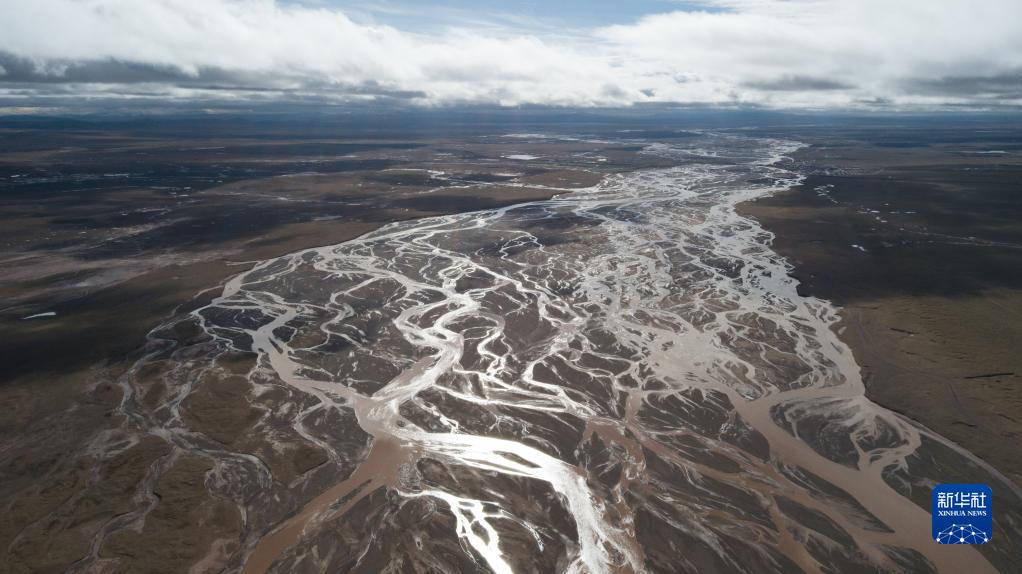 這是2022年7月27日在長江源地區(qū)拍攝的囊極巴隴河道,長江正源沱沱河和南源當(dāng)曲在此匯合(無人機(jī)照片)。新華社記者 肖藝九 攝