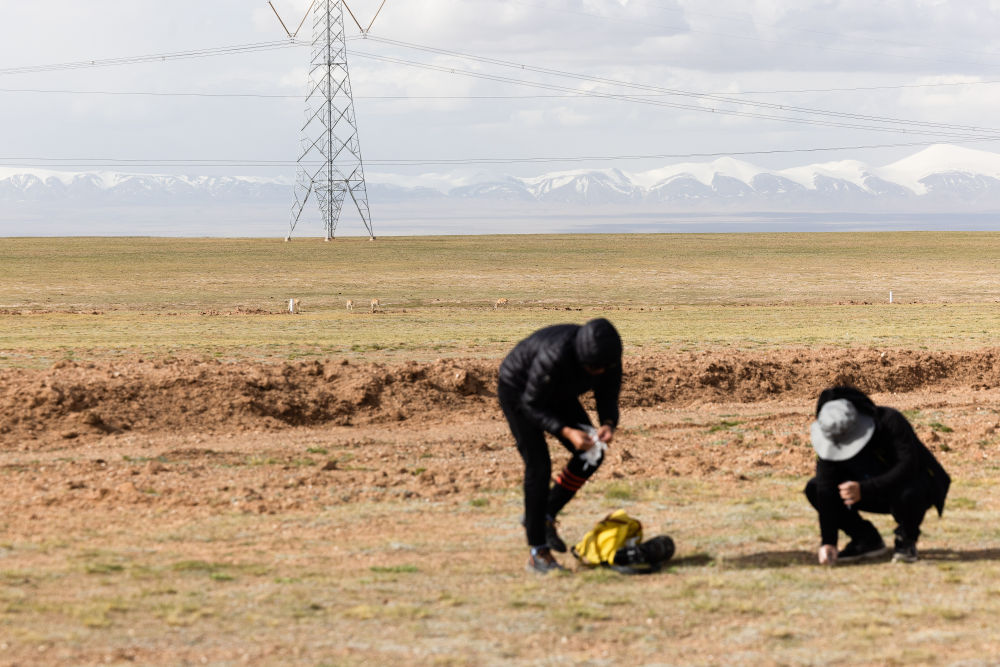 6月15日,中國科學(xué)院西北高原生物研究所研究員連新明(右)和他的學(xué)生王東在可可西里采集藏羚羊新鮮糞便樣本。