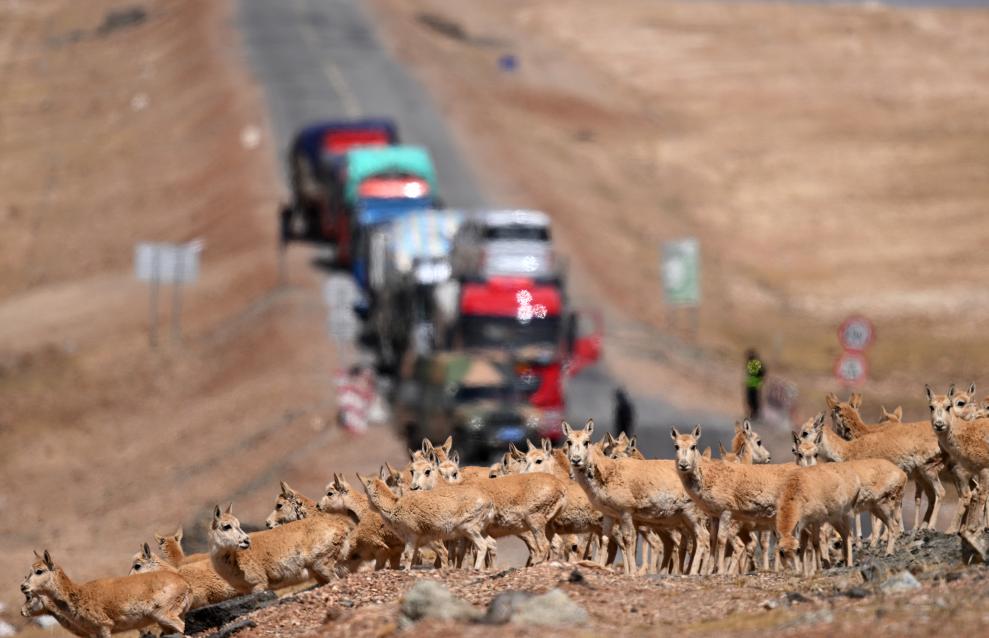 5月29日,在青??煽晌骼?,一群雌性待產(chǎn)藏羚羊通過青藏公路。新華社記者 張宏祥 攝