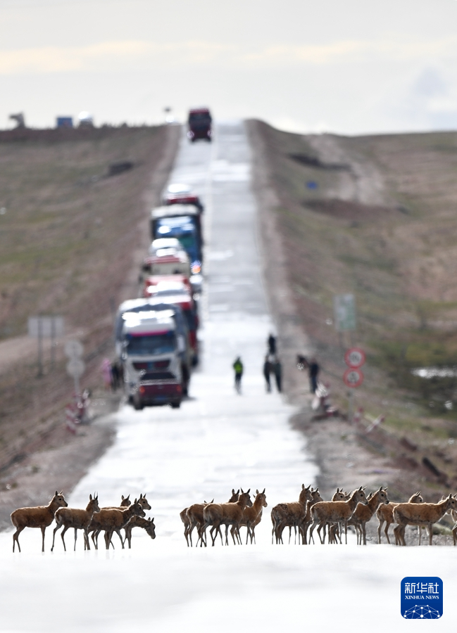 7月28日,一群藏羚羊通過(guò)青藏公路前往三江源地區(qū)的棲息地。新華社記者 張宏祥 攝