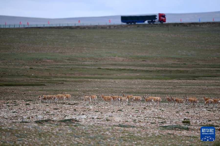 7月28日,一群藏羚羊通過(guò)青藏公路前往三江源地區(qū)的棲息地。 新華社記者 張宏祥 攝