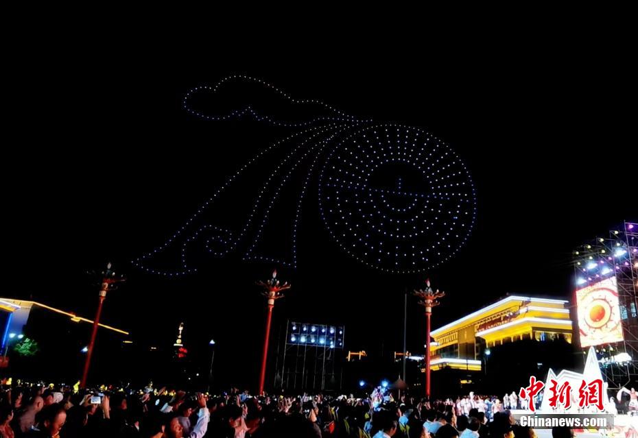 無人機秀現(xiàn)場,無人機組成“70”字樣。