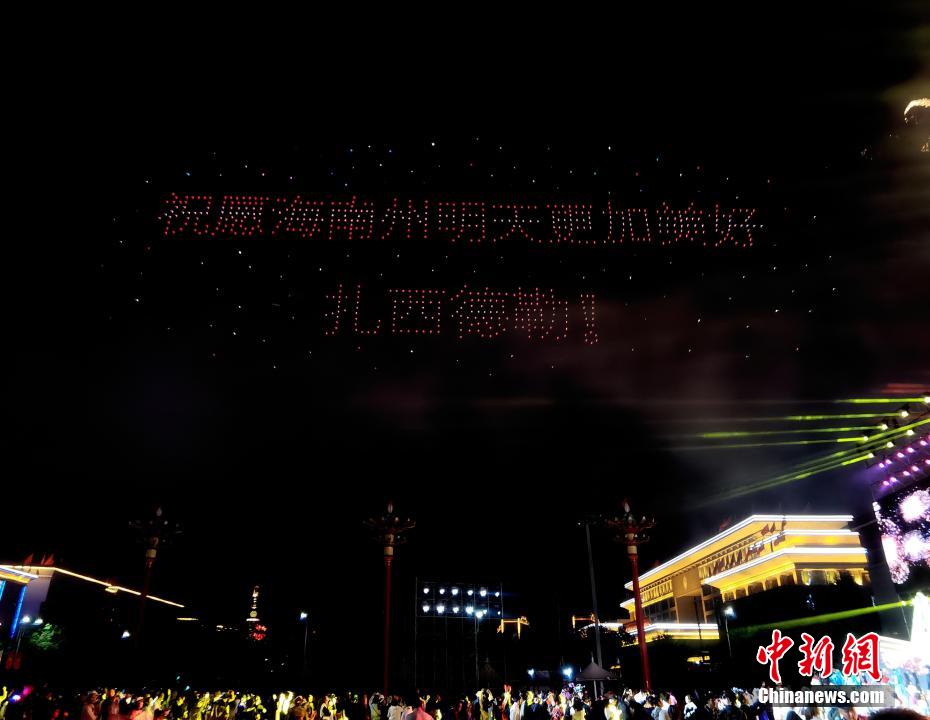 圖為無人機秀現(xiàn)場,無人機組成“祝愿海南州明天更加美好?扎西德勒”字樣。祁增蓓 攝