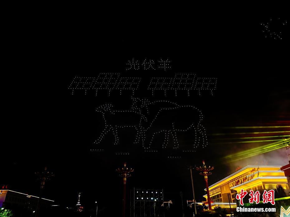圖為無人機秀現(xiàn)場,無人機組成“光伏羊”字樣。祁增蓓 攝