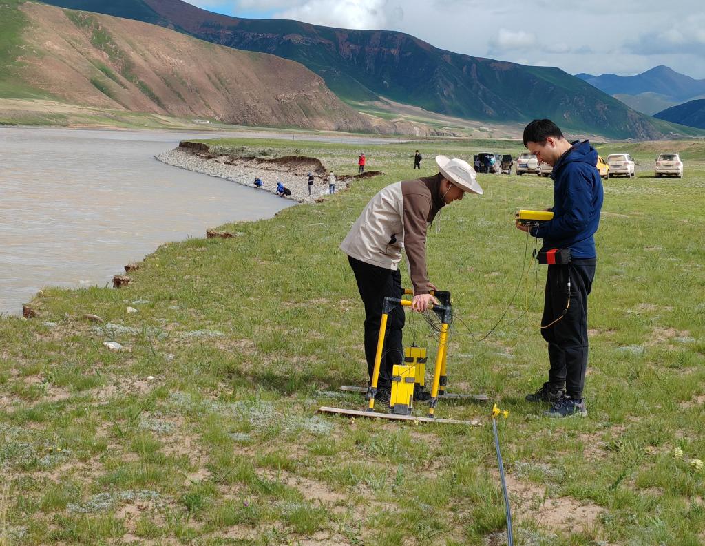 7月25日,范越(前左)和董士琦在長江上游干流通天河畔開展地質(zhì)雷達(dá)探測。(受訪者供圖)
