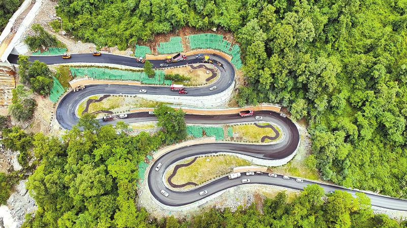 隨著道路基本修復(fù)完成,多個路段正進行瀝青路面鋪筑。俯瞰視角中,黑色的旅游公路盤山而上,逶迤山間。據(jù)介紹,海螺溝景區(qū)道路不是簡單重建,而是恢復(fù)提升,全線按三級公路標(biāo)準(zhǔn)建設(shè),路基全部拓寬至7.5米,并鋪設(shè)瀝青混凝土路面;部分急彎陡坡段進行了改善,提升了觀景臺、護欄的安全等級,行車舒適度大為提升。