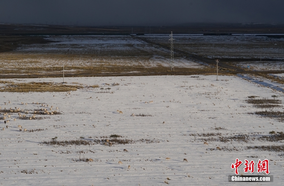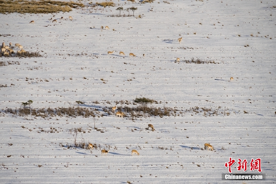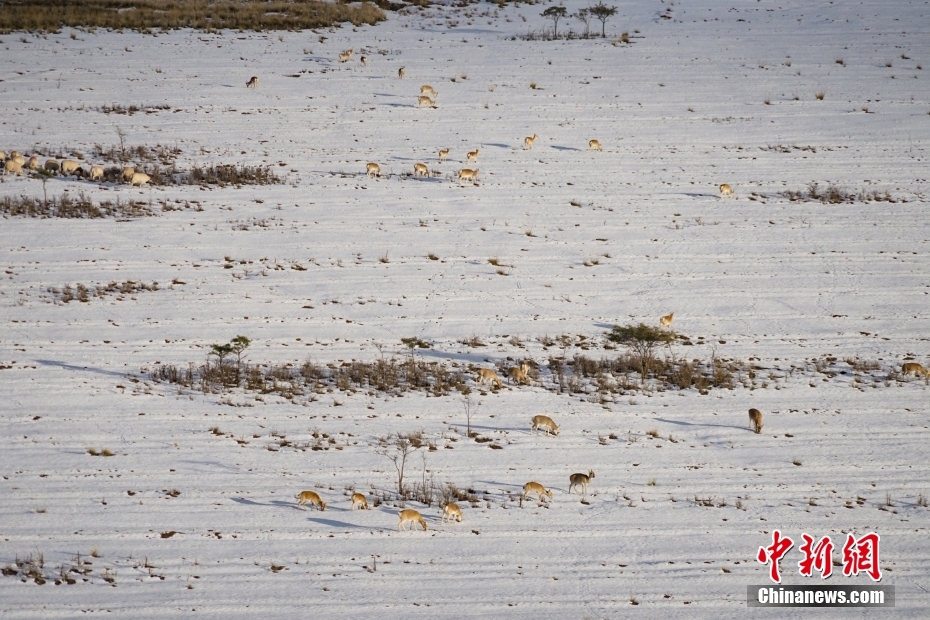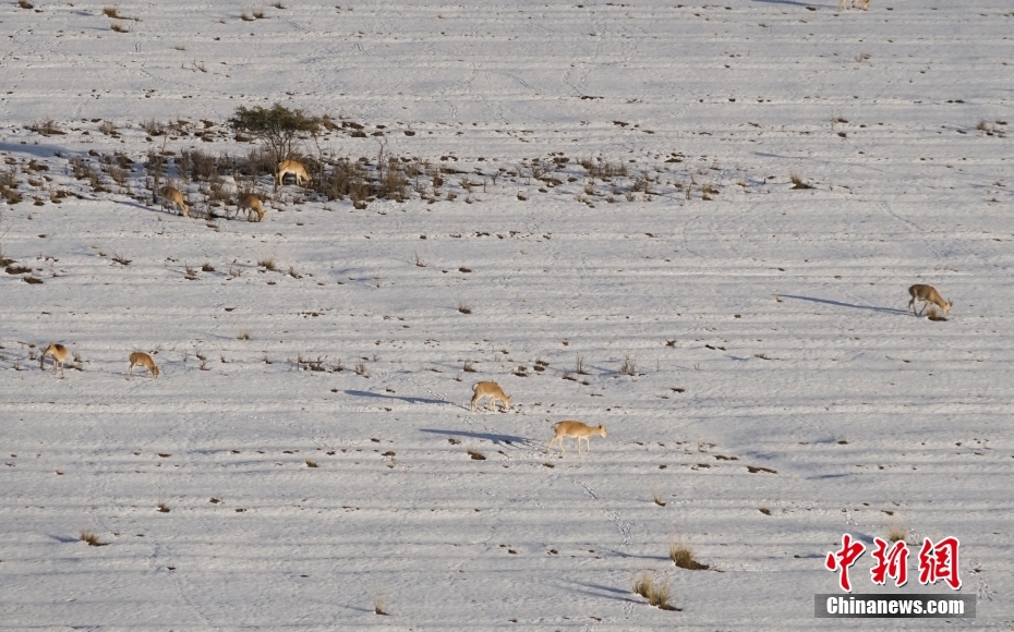 10月12日,成群普氏原羚在青海湖北岸雪中覓食、漫步。當(dāng)日,在青海湖北岸的青海省海北藏族自治州剛察縣哈爾蓋“羚羊小鎮(zhèn)”,成群的普氏原羚在雪中覓食、漫步。普氏原羚是世界瀕危物種、國(guó)家一級(jí)重點(diǎn)保護(hù)野生動(dòng)物,現(xiàn)僅分布于青海湖周圍,成為青海湖獨(dú)有的珍稀有蹄類動(dòng)物和旗艦物種。中新社記者 馬銘言 攝
