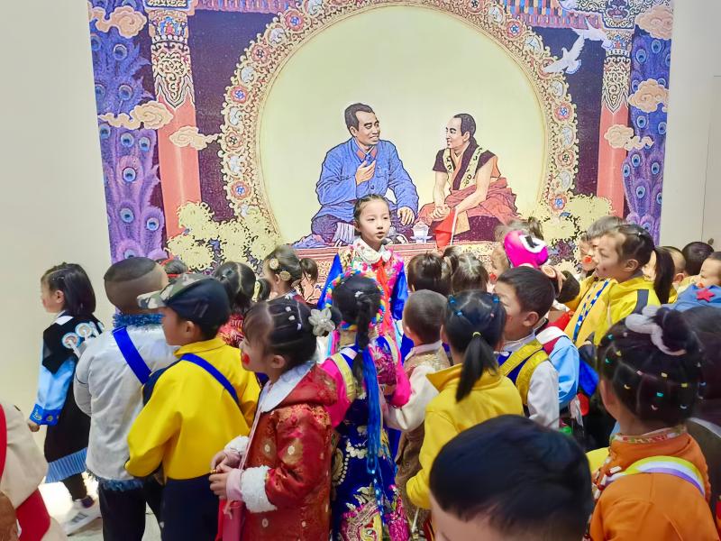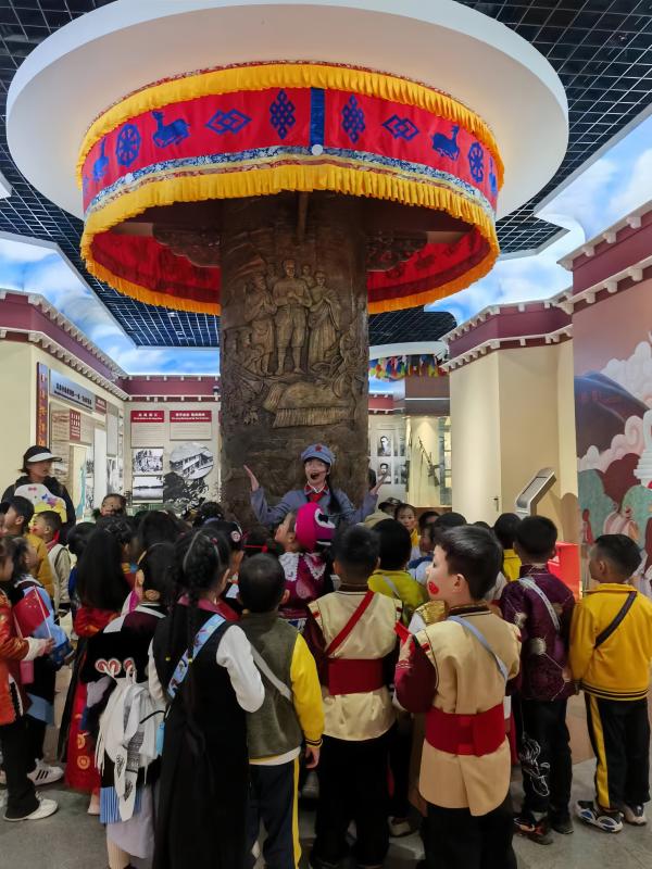 展館內(nèi),“格?;ㄐ⌒≈v解員”進(jìn)行著生動地講解,通過一件件文物、一幅幅圖片、一個個互動景觀訴說雪域高原上的紅色歷史,引導(dǎo)小朋友們體悟那段不平凡的崢嶸歲月,在行走的課堂里收獲知識和成長。
