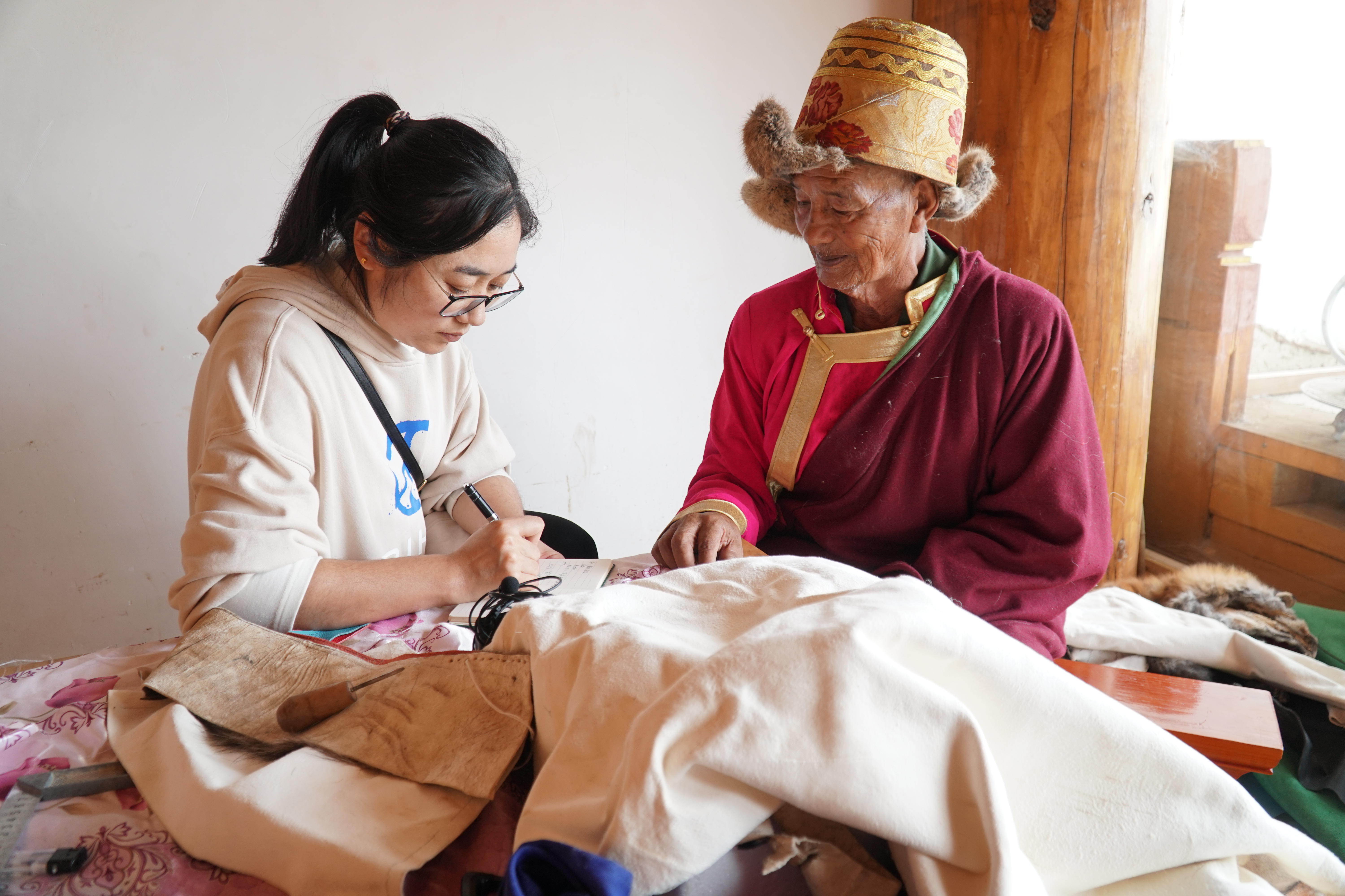 迪慶日?qǐng)?bào)社記者萬(wàn)瑪措在香格里拉市小中甸采訪州級(jí)皮革制作技藝傳承人。