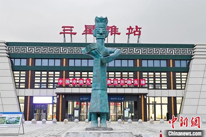 三星堆站位于德陽(yáng)廣漢市南興鎮(zhèn)與向陽(yáng)鎮(zhèn)交界處,距廣漢市區(qū)約5公里,距三星堆遺址約5公里,站場(chǎng)規(guī)模為2臺(tái)4線(xiàn)。車(chē)站廣場(chǎng)上,豎立著一尊青銅立人像,站房外立面將三星堆出土的青銅人面具抽象為車(chē)站整體造型,局部點(diǎn)綴回字紋雕花的仿古元素。同時(shí),裝飾裝修深化設(shè)計(jì)中將外立面檐口褐色調(diào)整為青銅色,彰顯了三星堆深遠(yuǎn)的人文背景?!败?chē)站站房以三星堆出土的青銅人面具造型為靈感?!敝需F九局成蘭站房項(xiàng)目部總工程師楊禮銘表示,施工過(guò)程中對(duì)鋁板內(nèi)部龍骨布置及鋁板分格進(jìn)行了數(shù)次優(yōu)化,順利完成站房裝飾裝修工程,投用后將成為當(dāng)?shù)匾坏貥?biāo)性建筑。
