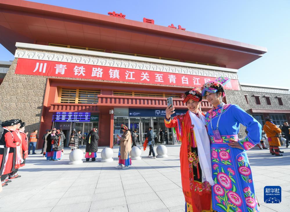 11月28日,在川青鐵路茂縣站,當(dāng)?shù)馗髯迦罕娫谡厩皬V場(chǎng)慶祝鐵路開通運(yùn)營(yíng)。新華社記者 王曦 攝