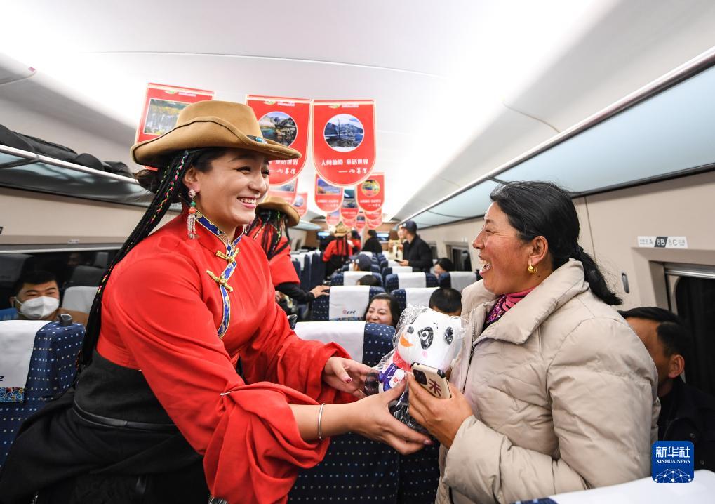 11月28日,在C6008次首發(fā)列車上,來(lái)自阿壩州民族歌舞團(tuán)的演員給乘客贈(zèng)送紀(jì)念品。新華社記者 王曦 攝