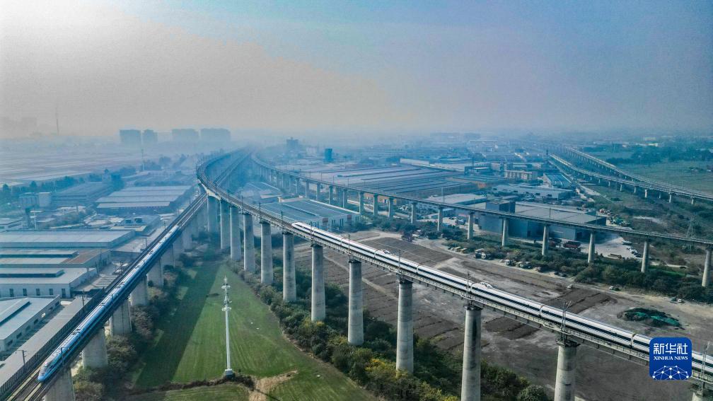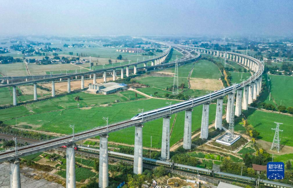 11月28日,在成都市青白江區(qū)境內(nèi)拍攝的行駛在川青鐵路上的列車(上)和行駛在西成高鐵線上的列車(下)(無(wú)人機(jī)照片)。新華社記者 王曦 攝