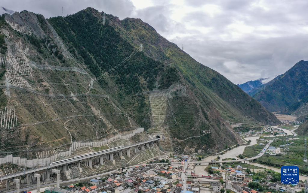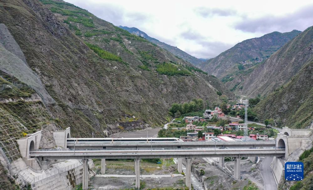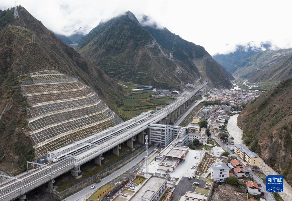 調(diào)試列車駛?cè)氪ㄇ噼F路茂縣站(10月13日攝,無(wú)人機(jī)照片)。新華社記者 王曦 攝