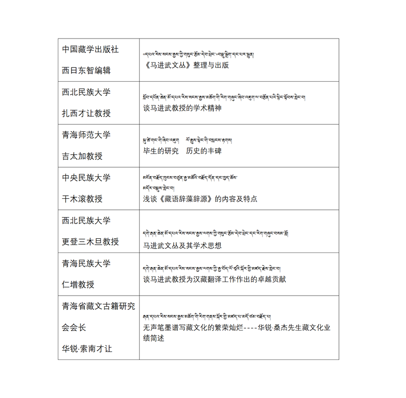中國藏學研究中心原副總干事洛桑靈智多杰,青海省省志辦原總編、藏文古籍研究會名譽會長謝佐,西北民族大學科研處副處長英加布,甘肅省藏學研究學會副會長傅千吉,宗拉昌瓦公司總經(jīng)理扎西加等專家學者對《馬進武文叢》的學術(shù)水平和現(xiàn)實意義給予了高度評價,認為該系列叢書不僅體現(xiàn)并傳承了馬進武先生的學術(shù)思想,而且在推動新時代藏語文研究和藏漢翻譯事業(yè)發(fā)展、促進學術(shù)合作,推動民族語言學學科繁榮和進步等方面,具有高度的學術(shù)性和現(xiàn)實意義。西藏自治區(qū)藏醫(yī)院副院長銀巴研究員、四川民族出版社社長澤仁扎西、青海師范大學原副校長扎布教授、夏壩·嘉央克珠、甘肅華銳剛乃旦才讓、青海民族大學旦正教授、青海民族出版社副社長阿寧·扎西東主等對《馬進武文叢》的出版發(fā)行表示祝賀。