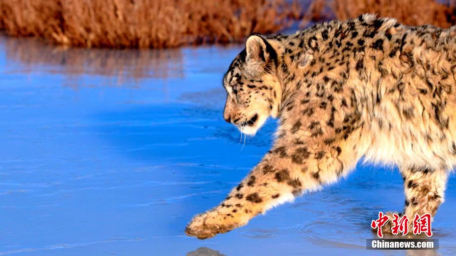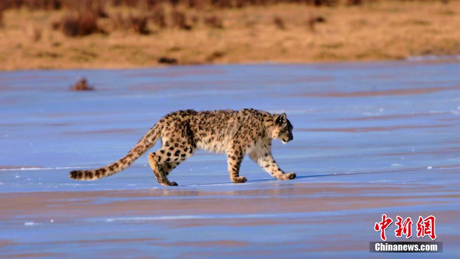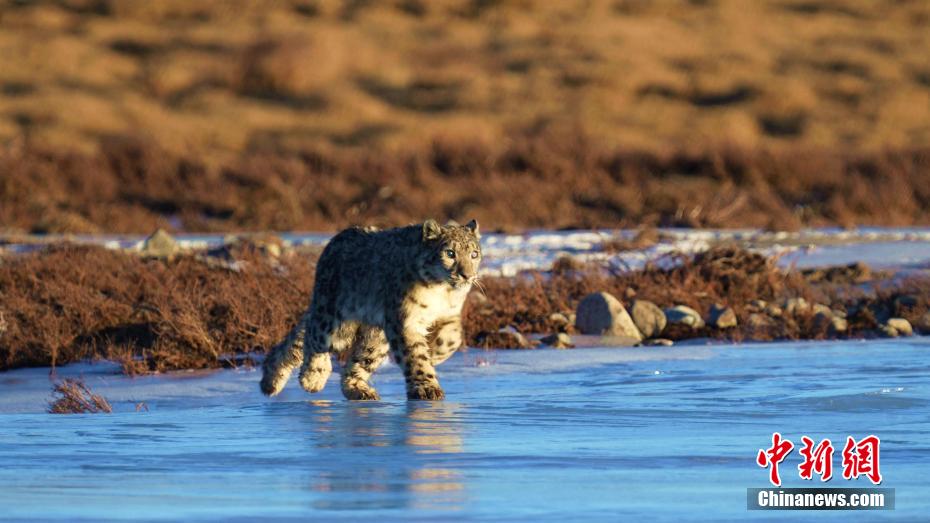 圖為雪豹在結(jié)冰的河面上行走。包雷 攝