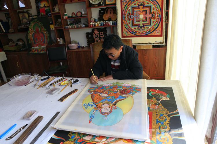 科考隊(duì)對玉科鎮(zhèn)的歷史街巷、傳統(tǒng)民居,進(jìn)行了系統(tǒng)的勘測和記錄。并對玉科鄉(xiāng)村遺產(chǎn)中活態(tài)延續(xù)的非物質(zhì)文化技藝與人居環(huán)境的共生關(guān)系,進(jìn)行了系統(tǒng)的走訪調(diào)研。在返鄉(xiāng)畫師、州級非物質(zhì)文化傳承人呷瓦家中,科考隊(duì)看到了繪制在絲絹上的唐卡。呷瓦早先曾在北京游藝,深受當(dāng)?shù)匚幕绊懀笠蚣亦l(xiāng)的鄉(xiāng)村文旅發(fā)展火熱,就帶著滿心的故土鄉(xiāng)愁回到家鄉(xiāng)授徒創(chuàng)業(yè)。在家鄉(xiāng),呷瓦把藏族傳統(tǒng)唐卡繪畫與中國傳統(tǒng)的水墨畫相融合,首創(chuàng)了這樣創(chuàng)新的畫法。