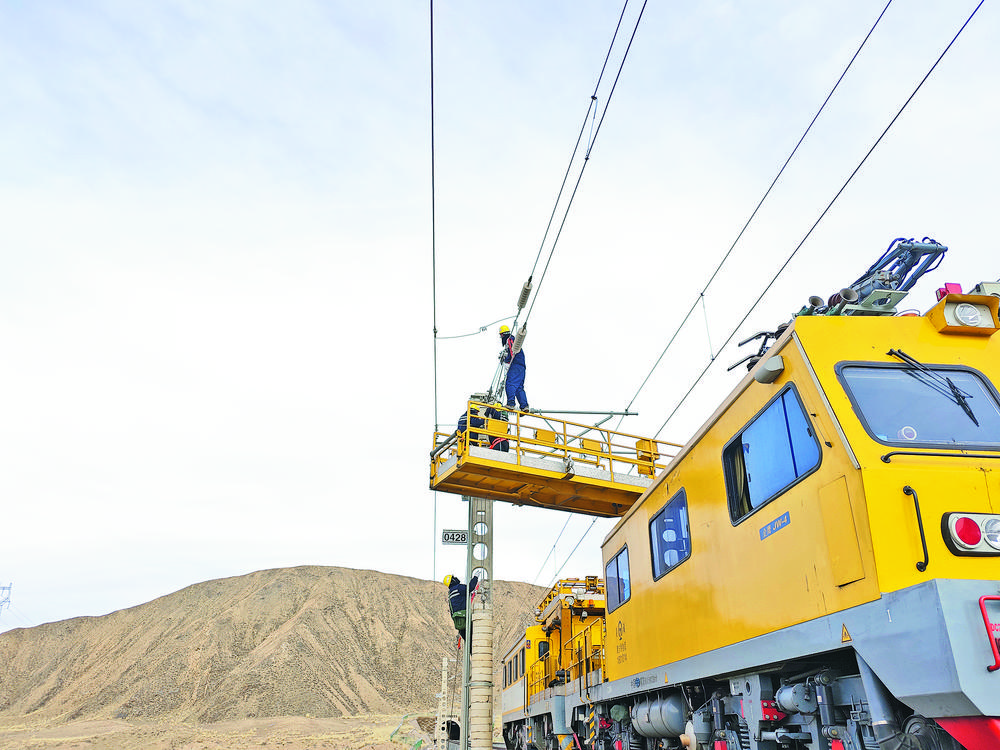 職工利用接觸網(wǎng)作業(yè)車平臺(tái)進(jìn)行故障消缺。西寧供電段供圖