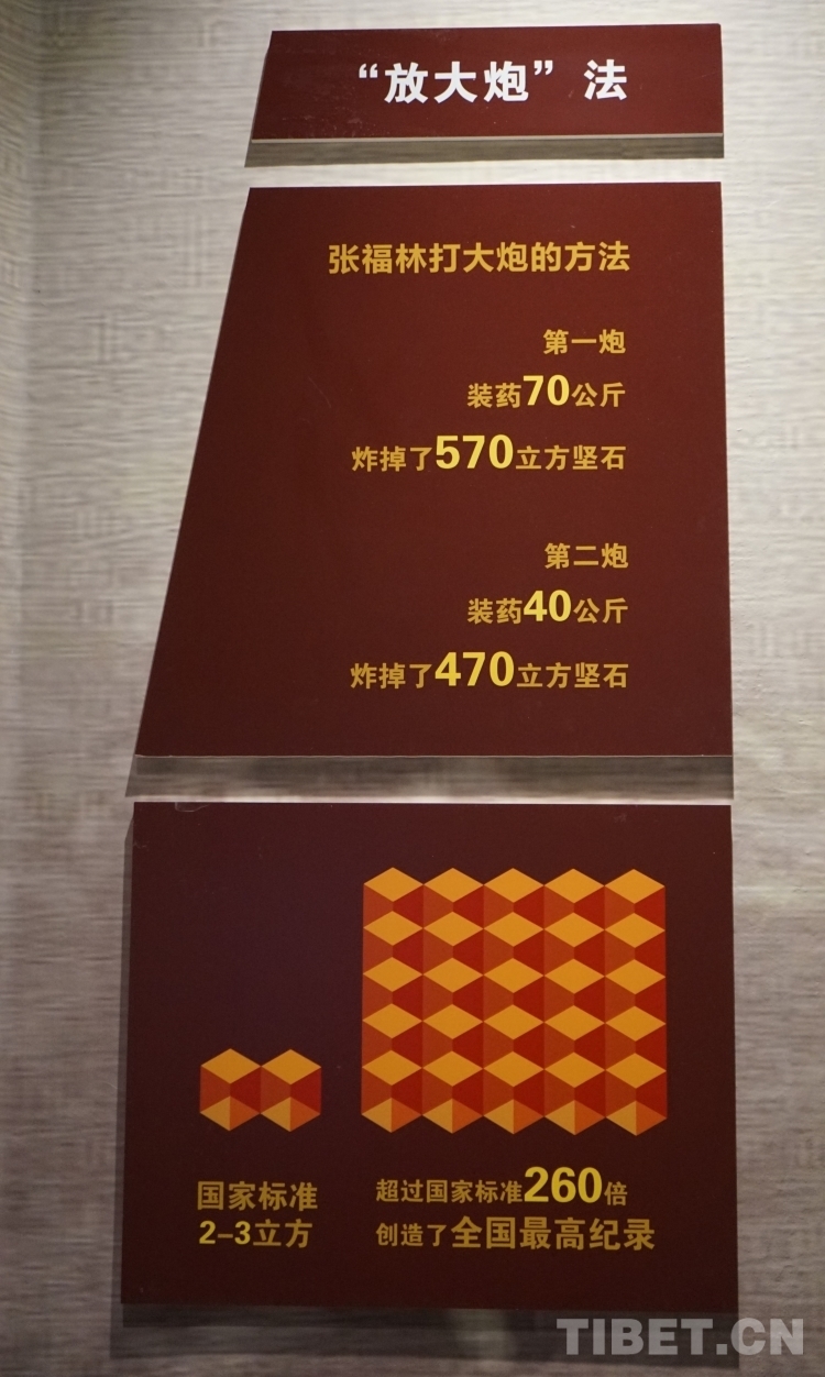 在雀兒山修路時,張福林白天與戰(zhàn)友們懸在巖壁上打炮眼,晚上到工地上研究堅石、孤石、松石、片石等各種石頭的打眼、裝藥、放炮等技術,并積極向工程人員、技工同志、工兵部隊學習,最終提出了改進裝藥的方法,即“放大炮法”?!胺糯笈诜ā钡谋乒πС瑖覙藴?60倍,創(chuàng)造了全國爆破的最高紀錄。這一方法不僅能提高工效,還能節(jié)約炸藥,在筑路部隊中得到全線推廣,張福林也被大家譽為“大炮手”。