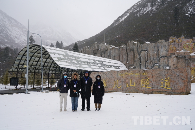 圖為川藏線采訪隊記者在雪中的雀兒山隧道口合影留念 攝影:達瓦次仁