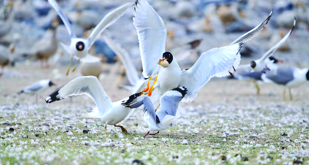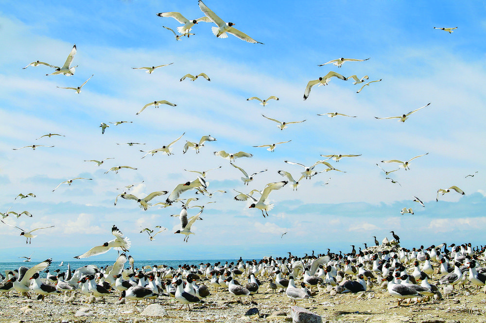 候鳥北歸,青海湖又將進(jìn)入一年中最美麗的時(shí)節(jié)。浮想盛夏時(shí)節(jié),棕頭鷗、漁鷗、斑頭雁、普通鸕鶿等水鳥,或成群在低空中擺著“隊(duì)形”,或“拖家?guī)Э凇痹谒嫔湘覒蛲嫠#蚝弯в蔚匿音~上演魚鷗“大戰(zhàn)”,碧波蕩漾的青海湖將美得如詩(shī)如畫。(本版圖片除署名外,其他均由青海湖景區(qū)保護(hù)利用管理局提供)