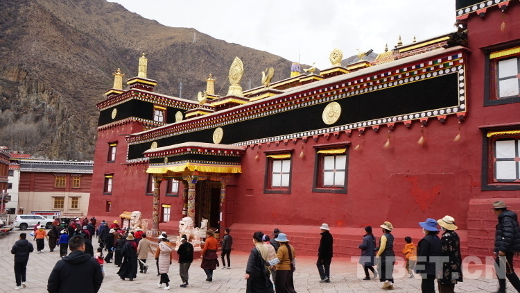 圖為德格印經(jīng)院大門(mén),院外有許多游客在轉(zhuǎn)經(jīng) 攝影:張宇