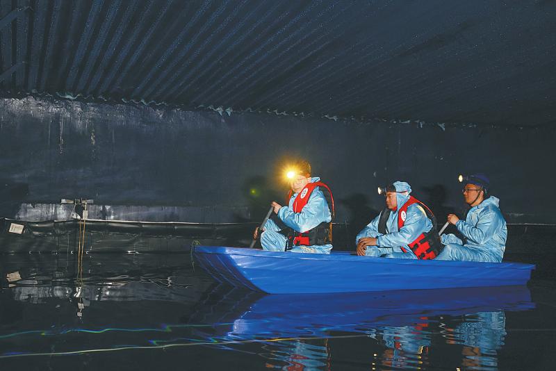 劃著小船進入探測器內部,體感溫度逐漸降低,這里的濕度超過90%,水溫接近零攝氏度。通過手電筒射出的光柱,隱約看得見大家呼出的白氣,燈光照射之外的區(qū)域就是極致的黑暗。