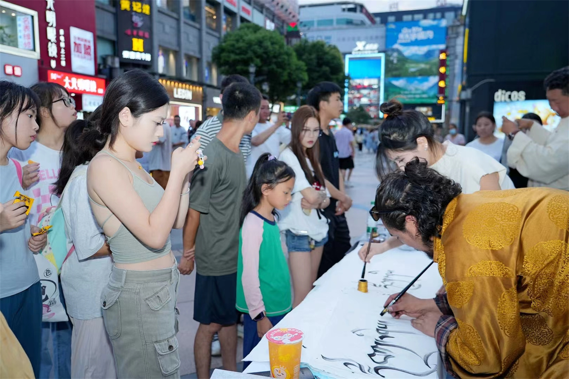 臨近傍晚,在春熙路“丹青繪盛景 筆墨頌祖國”藏文書法展演區(qū),兩位身著藏族傳統(tǒng)服飾的書法老師端坐于案幾之后,他們手持毛筆,蘸取特制的藏墨,在潔白的宣紙上揮灑自如,一筆一劃間流露出濃厚的藏族文化韻味。他們書寫的藏文內(nèi)容多為吉祥如意的祝福語,每一幅作品都蘊(yùn)含著對(duì)美好生活的向往和對(duì)遠(yuǎn)方來客的誠摯歡迎。