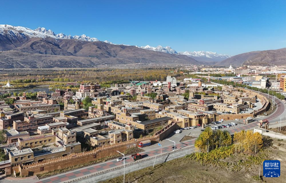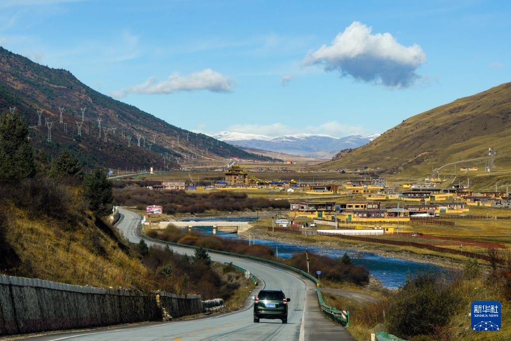 在四川省甘孜藏族自治州拍攝的國(guó)道317公路,路邊是甘孜縣格薩爾王城景區(qū)(10月29日攝,無(wú)人機(jī)照片)。新華社記者 王曦 攝