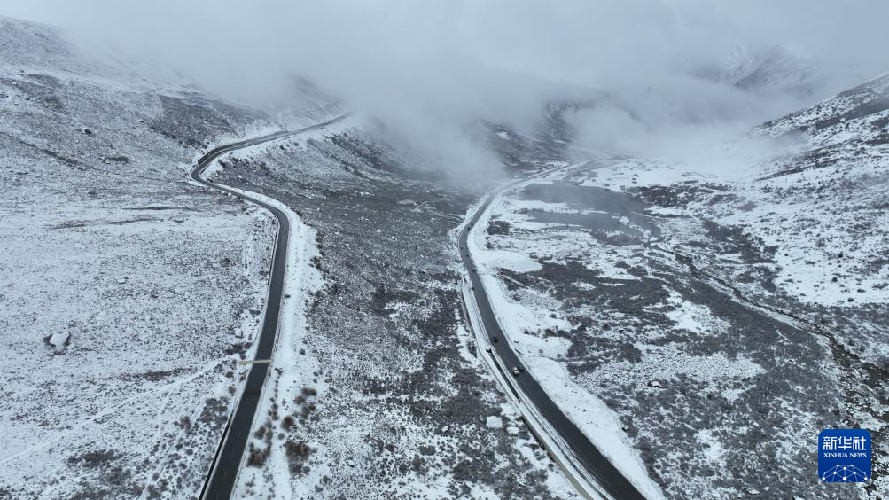 雪后,在西藏自治區(qū)左貢縣境內(nèi),車(chē)輛在通往東達(dá)山埡口的國(guó)道318公路上等待通行(11月6日攝,無(wú)人機(jī)照片)。新華社記者 沈伯韓 攝