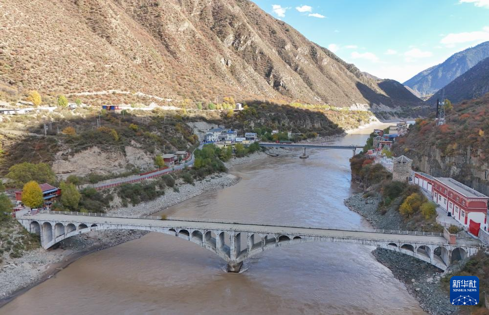 在四川省甘孜藏族自治州巴塘縣竹巴龍鄉(xiāng)拍攝的國(guó)道318公路連接四川和西藏的金沙江大橋老橋(近)和新橋(11月6日攝,無(wú)人機(jī)照片)。新華社記者 王曦 攝