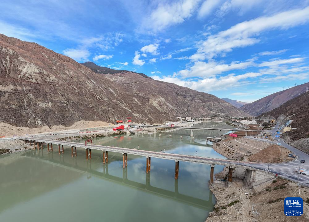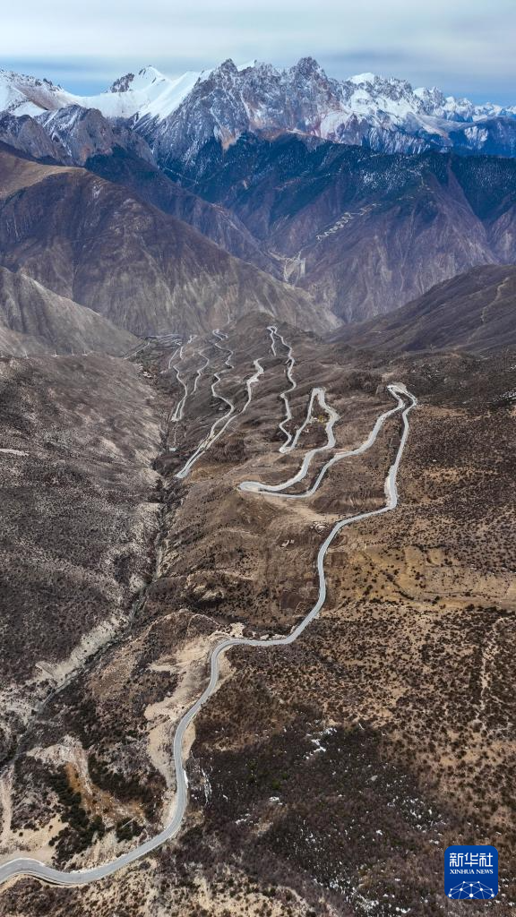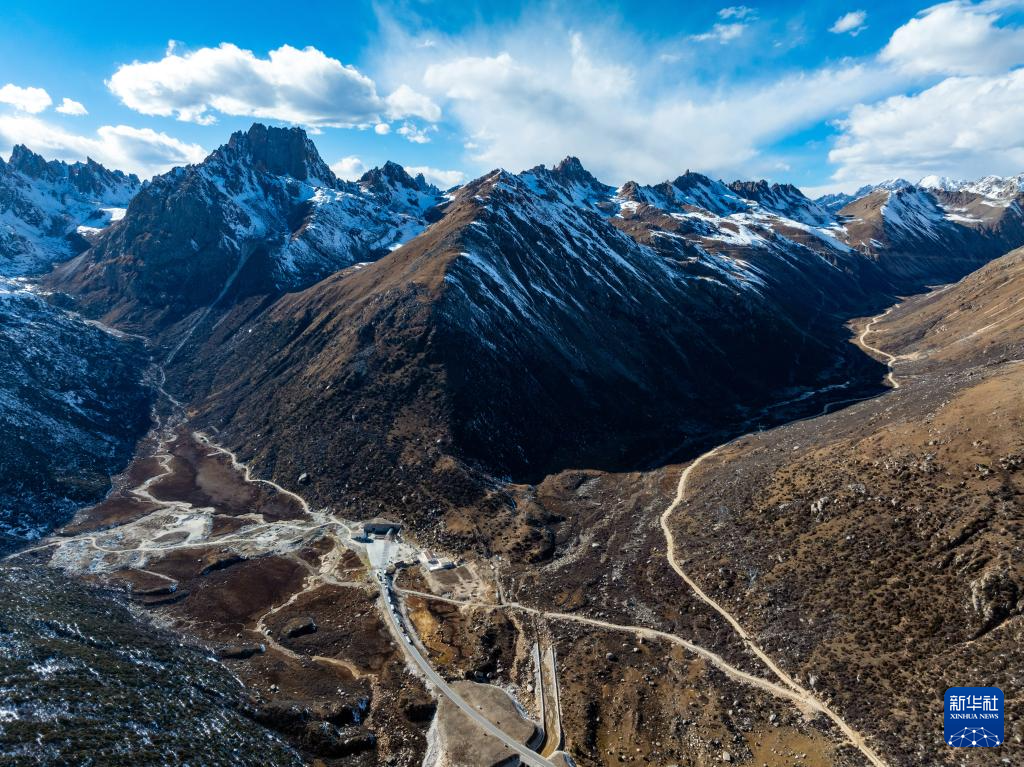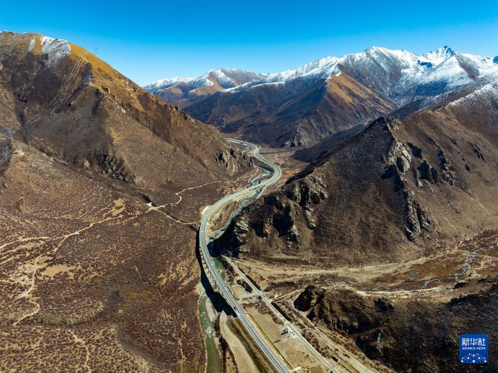 連接四川和西藏的國(guó)道317公路崗?fù)写髽蚶蠘颍h(yuǎn)處是新修的崗?fù)写髽颍?1月2日攝,無(wú)人機(jī)照片)。新華社記者 王曦 攝