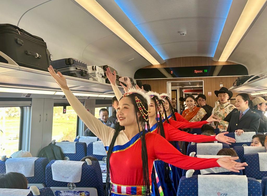 11月25日,“發(fā)現(xiàn)最美鐵路·尋夢(mèng)香格里拉”活動(dòng)中,乘務(wù)員向游客介紹麗香鐵路并表演節(jié)目。新華社記者 陸君鈺 攝