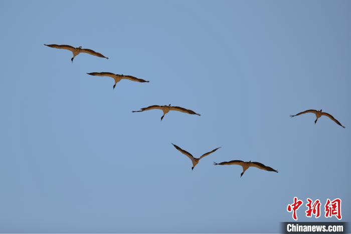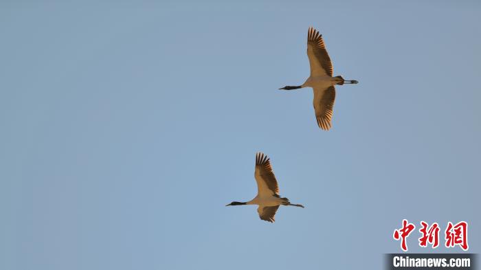 兩只黑頸鶴結伴翱翔,姿態(tài)優(yōu)美?!〗w波 攝