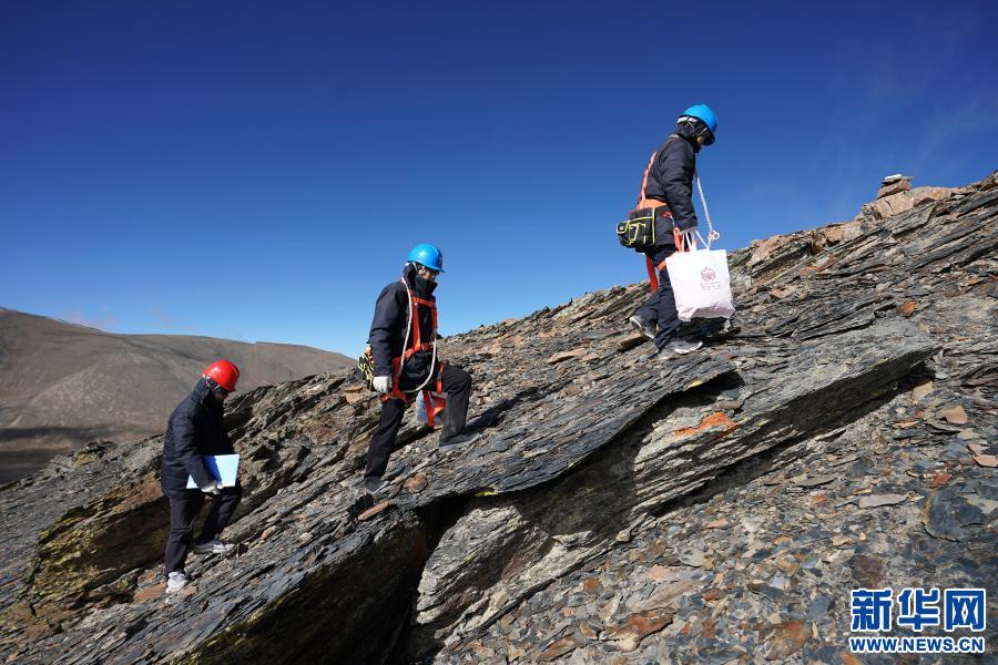 在西藏山南市洛扎縣,國家電網(wǎng)山南供電公司輸電運檢中心員工龔朝偉(右)和國家電網(wǎng)安徽省電力有限公司援藏工作人員徐四勤(中)、吳寅(左)向浪洛線197號鐵塔前進(jìn)(2020年11月4日攝)。新華社記者詹彥 攝