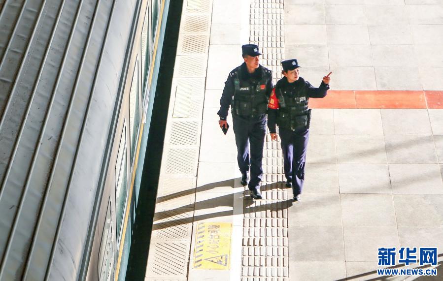 1月10日,“女子格?;ā本M民警雷穎君(右)與同事在火車站里巡邏。新華社發(fā)(胡安鵬、黃飛攝影報道)
