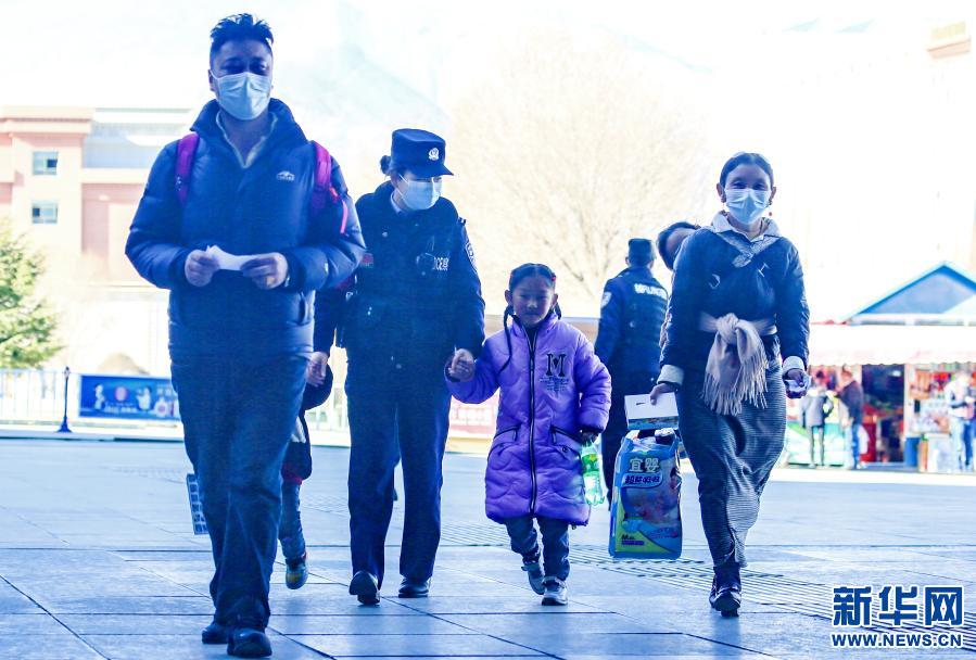 1月10日,“女子格桑花”警組民警在拉薩火車站帶領(lǐng)小旅客出站。新華社發(fā)(胡安鵬、黃飛攝影報道)