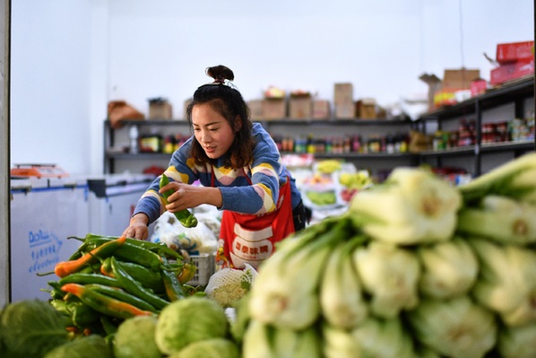 在西藏昌都市丁青縣尺牘鎮(zhèn)農(nóng)貿(mào)市場(chǎng),商販在整理蔬菜。記者 詹彥 攝