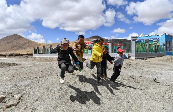 在我國(guó)海拔最高的行政鄉(xiāng)——西藏山南市浪卡子縣普瑪江塘鄉(xiāng),小朋友們?cè)谛陆ǔ傻挠變簣@前玩耍。記者 晉美多吉 攝