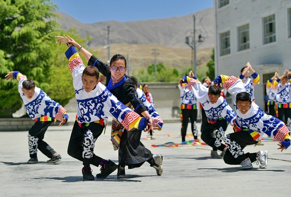 在西藏山南市第一高級(jí)中學(xué),來(lái)自湖北省武漢市旅游學(xué)校的援藏教師馬丹(左三)指導(dǎo)學(xué)生練習(xí)校園啦啦操。記者 張汝鋒 攝
