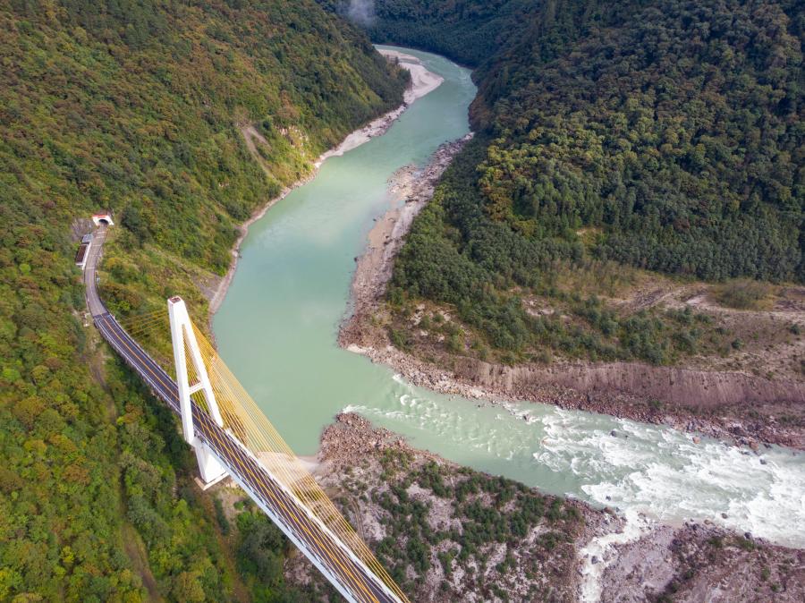 川藏公路通麥路段上的迫龍溝特大橋(2019年10月27日攝,無(wú)人機(jī)照片)。新華社記者 孫非 攝