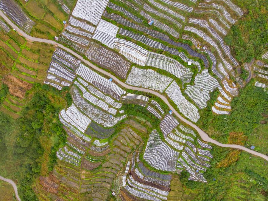 這是穿過(guò)西藏墨脫縣郊農(nóng)田的一條農(nóng)村公路(2019年10月26日攝,無(wú)人機(jī)照片)。新華社記者 孫非 攝
