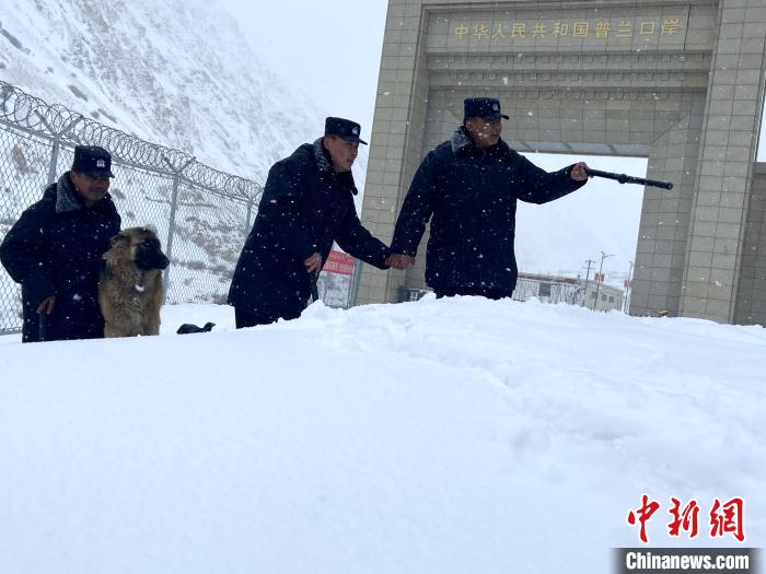 圖為在積雪中守衛(wèi)國(guó)門的普蘭邊檢站民警?!∑仗m邊檢站供圖