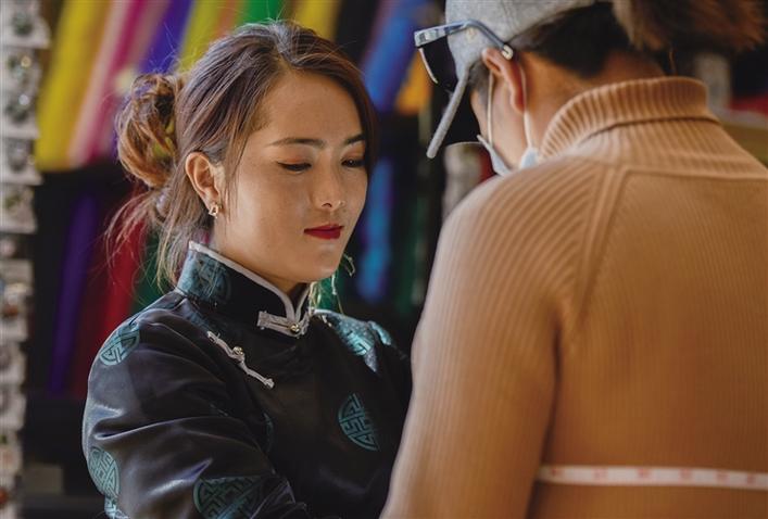 “老板,你家還有這款藏裝嗎?我想要一款?!痹谠摰陜?nèi),市民卓嘎拿出手機,指著格桑措姆錄制的藏裝短視頻說道?!坝械?,這是我們今年推出的新款,是對傳統(tǒng)的藏裝進行了改良,主要是體現(xiàn)在領口處,改良后的藏裝對領口部位進行了復古簡約化設計,使其兼具美觀性與舒適性,再搭配一個‘卡烏’堪稱完美?!备裆4肽方榻B道。