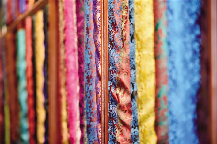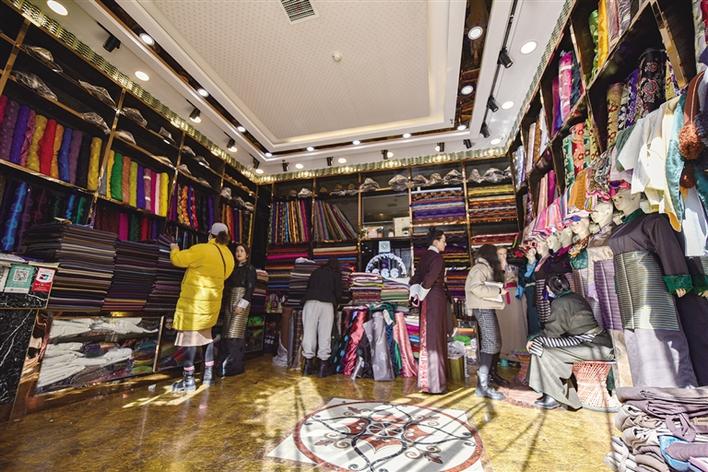 近日,記者來到位于神力時代廣場的666時尚藏裝店,剛進店門就被眼前琳瑯滿目的布料所吸引,一匹匹布料整齊地擺放在櫥窗里,讓人目不暇接。店內(nèi)的顧客也在挑選著面料、款式,而藏裝店的老板也在不停地為顧客介紹今年的各類新款,供顧客選擇。