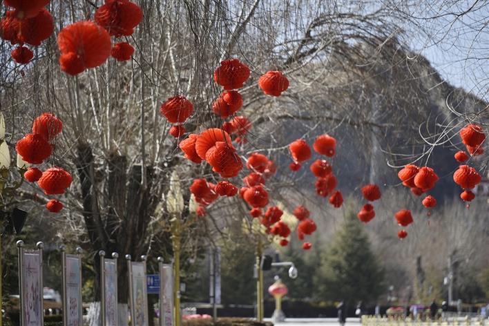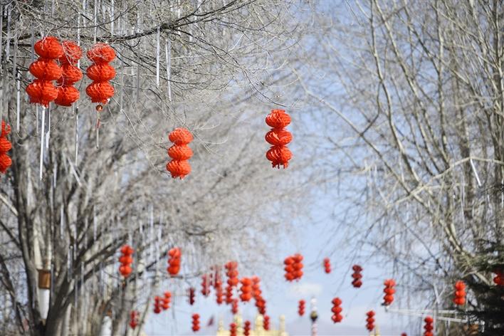 紅色總會給人以一種喜慶的感覺!走在拉薩的街頭,一串串紅彤彤的燈籠高高掛在樹枝上,錯落有致,格外吸引眼球。除了大街小巷上用于裝飾的紅燈籠,過年時每個人家里也必定少不了紅色的點綴,走進(jìn)年貨市場,人們左顧右盼,精心挑選著印有“扎西德勒”、“吉祥如意”等字樣的對聯(lián)、年畫,此外,各種“?!痹氐募槲飩涫苁忻袂嗖A。