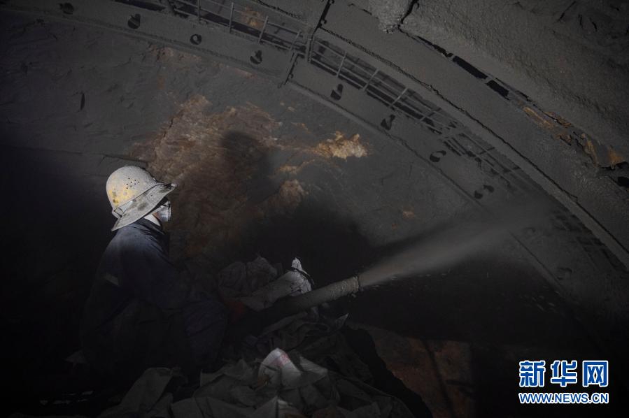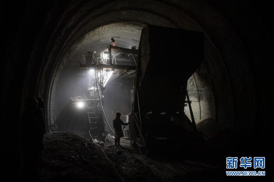 2月10日,在派墨公路老虎嘴隧道出口端,工作人員在進行二次襯砌施工。新華社記者 孫非 攝