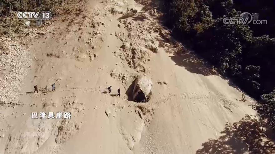 幾個小時后,搬家的隊伍來到了巴隆懸崖路。剛搶通不久的巴隆懸崖路依然時有滾石和塌方出現,十分危險。在能保證絕對安全的情況下,大家決定等待時機,一邊搶通,一邊過人。